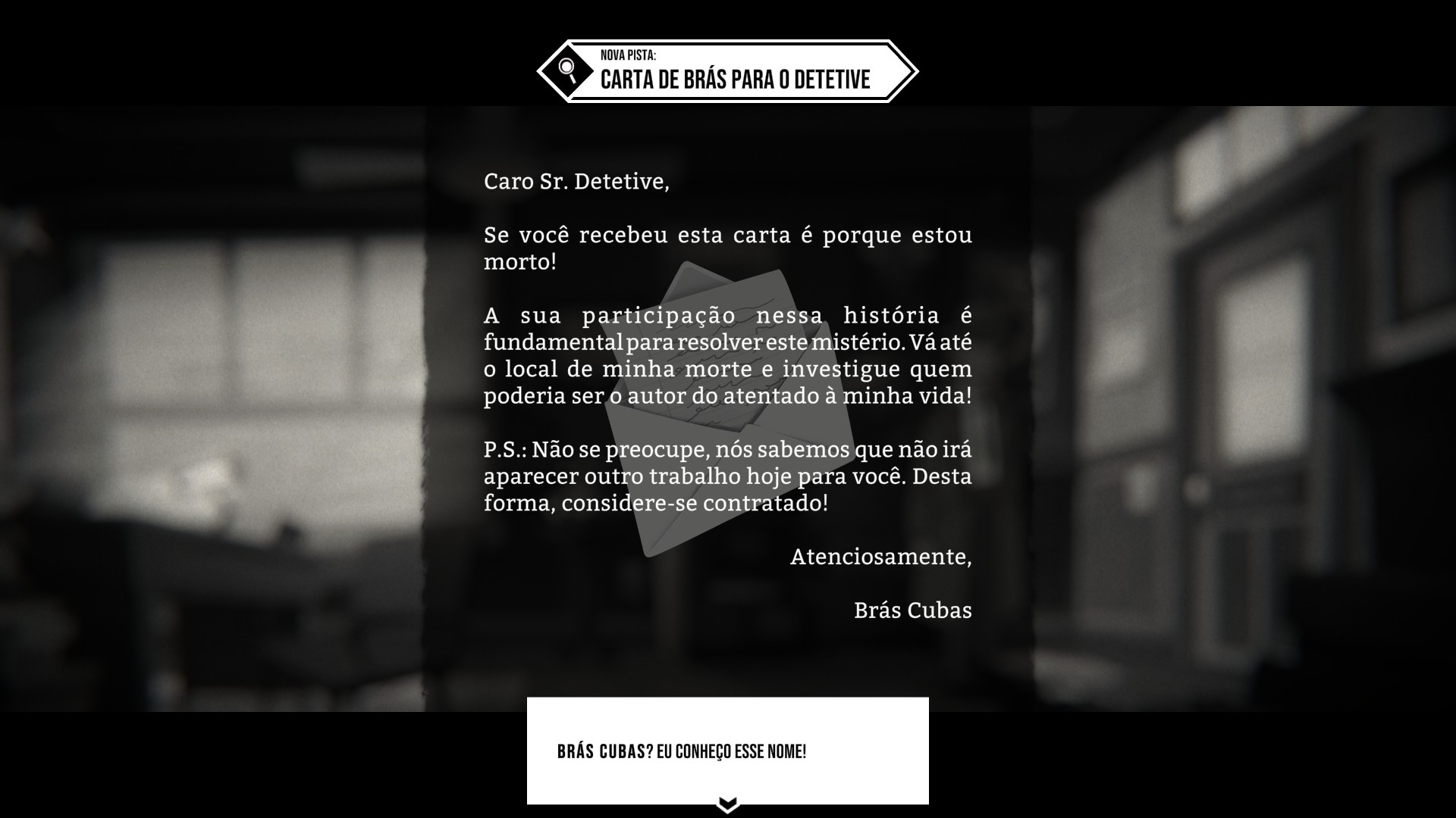 Mas espere! Uma carta chegou logo pela manhã e está endereçada ao Detetive, que prontamente procura pelo seu remetente. Um nome então aparece: Brás Cubas.