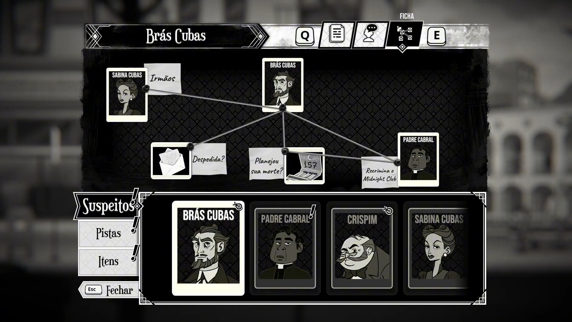 Cada um desses lugares traz um pouco da magnitude da obra de Machado de Assis e seus personagens. Então, não é incomum encontrar com Capitu e Bentinho de “Dom Casmurro”, Dr. Simão Bacamarte de “O Alienista”, e claro, Quincas Borba e sua doutrina, o Humanitismo. Tudo aqui está inteiramente conectado e as relações de todos os personagens entrem si e como isso deságua de alguma forma no crime central investigado no jogo é um trabalho primoroso.