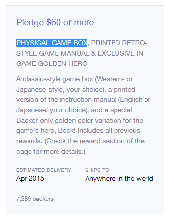 Isso por que, os fãs que doaram uma determinada quantia, teriam como recompensa, uma cópia física do jogo, com manual de instruções impresso, remetendo às clássicas caixas dos jogos do MegaMan.
