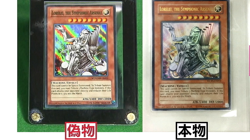 Abaixo, é possível ver um comparativo entre os dois cards, onde o real é rotulado como 物 物 (honmono), enquanto que a réplica é etiquetada como 偽 物 (nisemono).