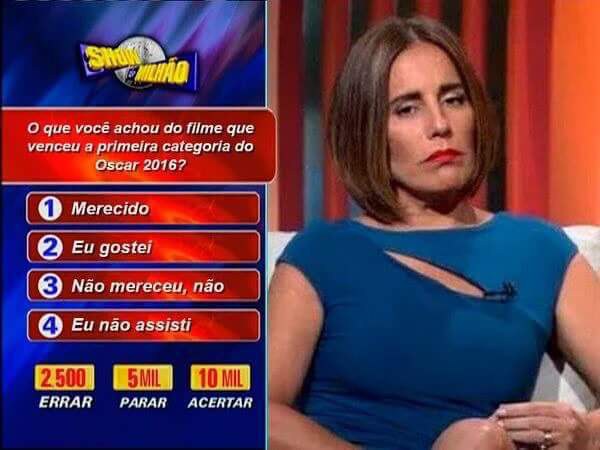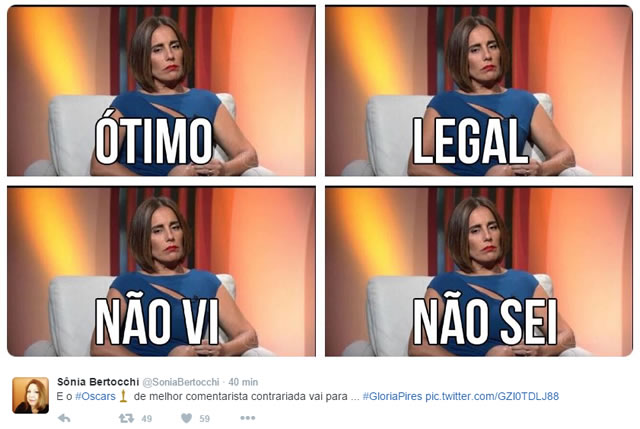 “Bacana” e “achei interessante”, foram algumas das “observações pertinentes” feitas por Glória Pires no decorrer da premiação. Se pá, ela é meio “cabeça” pra filmes como Mad Max ou Perdido em Marte.