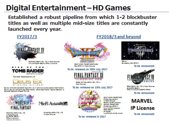 Entre os principais nomes, estão a nova IP da empresa em conjunto com a Marvel, que teve seu desenvolvimento iniciado recentemente, além dos já citados FF VII Remake e KH3.
