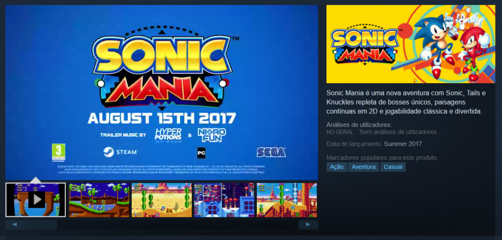 Lembrando que 2017 marca o lançamento de dois games envolvendo a marca Sonic, sendo Mania e Forces.