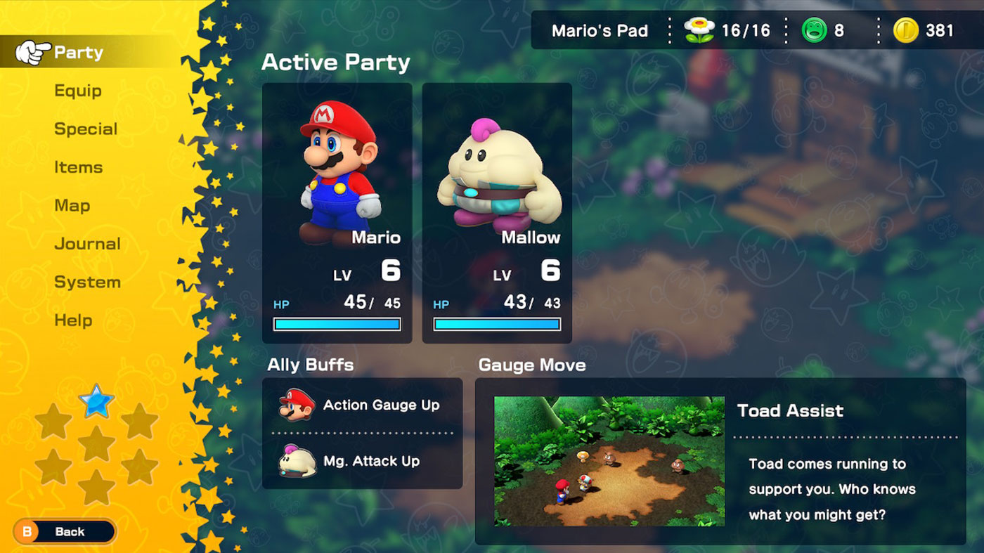 Algo que também veio para melhorar a experiência do game foram os menus. Os menus originais de Super Mario RPG nunca foram lá muito bonitos ou responsivos. Já o remake trouxe menus mais completos e com adições bem interessantes. Uma delas chama-se Journal, em que Mallow utiliza como uma espécie de diário, relatando todos os momentos chave da trama, e que você pode revisitar para poder saber mais sobre a história, ou se você ficar muito tempo sem jogar, saber em que ponto da trama está.